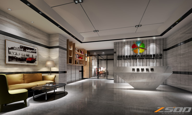 2015年1月我司与湖南和泰新能源汽车科技有限公司达成合作,由我司负责设计其位于中南汽车世界的公司总部办公室,下图为办公室前厅。