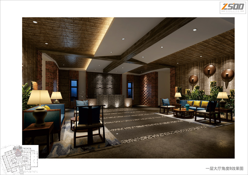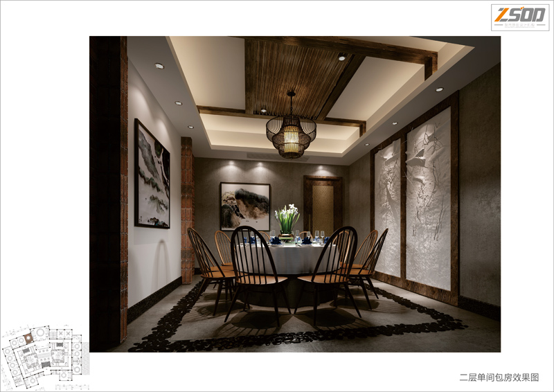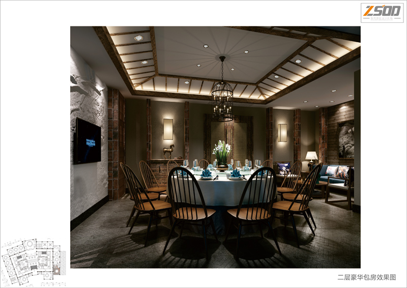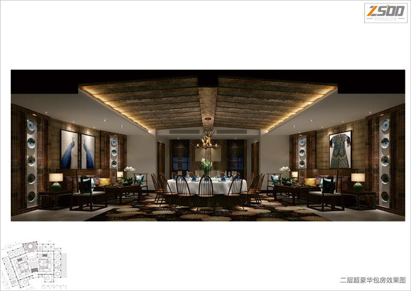 现设计师的设计意图。包厢部分,材质的运用上大量的废旧回收木料+回收红砖+竹枝等材料的使用,继续着这种原生态的基调。并通过简约中式+孔雀